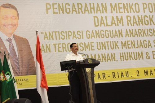 Kampar, - Menteri Koordinator Politik, Hukum dan Keamanan RI, Luhut Panjaitan, memberikan pengarahan kepada Bupati/ walikota pada kegiatan Antisipasi Gangguan Anarkisme, Radikalisme dan Terorisme untuk menjaga stabilitas Politik, Keamanan, hukum ...